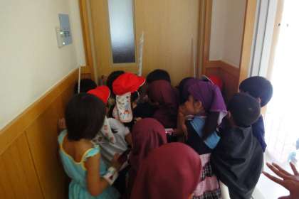 そして,幼稚園のある部屋の中に動く白い影が!まさか,忍者がこの中に?!しかし,鍵がかかっています。鍵をつくってきたり手裏剣で鍵穴に入れたり,みんなで扉を押したりしますが,開きません。