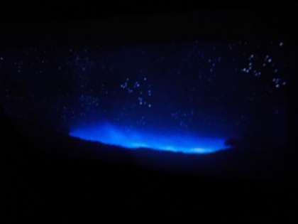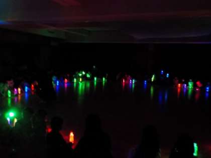 おやつを食べた後には,キラキラボトルとライトを組み合わせてキラキラライトに変身させて点灯をしました。みんなで大きな円になって「3・2・1」で電気を消していくと・・・「うわぁー!」「きれーい」とキラキラの色の変わっていく様子を感動しながら見ていました。