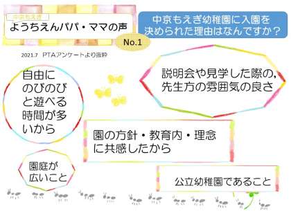 中京もえぎ幼稚園に在籍する保護者のみなさんの声をPTAアンケートでまとめてくださいました。その抜粋です。ご覧ください。