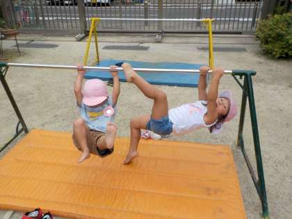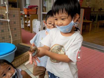 園庭では虫探しや水遊び,鉄棒など,先生や友達と一緒に元気いっぱい遊ぶ姿がありました。また,新しく幼稚園にやってきたひよこや,御所南小学校からいただいたカブトムシの幼虫と楽しく触れ合う様子もありました。