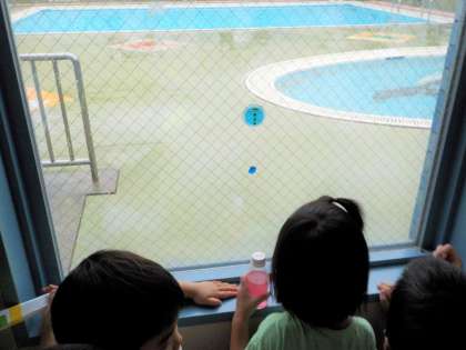3歳児もも組では自作のお面をかぶってお化け忍者に変身すると,積み木をつかって大きな船をつくり宇宙や海底に探検に出かけては「サメが来たぞ!食べられないように注意して」「あそこにチョウチンアンコウがいる!」とイメージの中での遊びを楽しんでいます。実際に2階や3階に出かけて「プールに泡がたくさんある!」「もしかしてクラゲじゃない?」と,いろいろなものを見つけることも楽しんでいます。