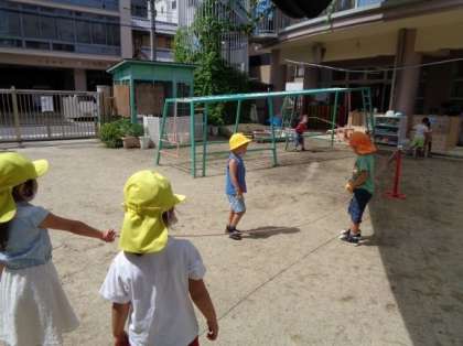 園庭でも縄跳びをして楽しんでいる子どもたちがいました。「いくよー!」と声をかけながら縄を回す子どもと跳ぶ子どもが息を合わせていました。これからもいっぱい体を動かして遊ぼうね!
