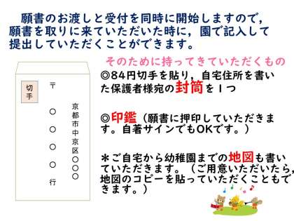 事前に知っておいていただけると,スムーズに入園手続きができるかと思いますので,下記をご参照ください。よろしくお願いします。