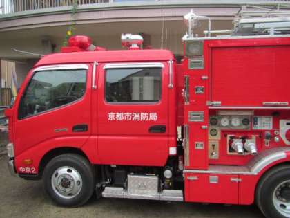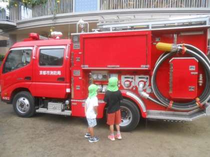 中京消防署から消防自動車が幼稚園に来ました。朝から「消防車まだ?」ととても楽しみにしていた子どもたち。近くで見るととても大きく迫力があり「おっきい!」「ポンプ車だ!」「すごいなあ」とじっくりと見る姿がありました。また,消防士の方に「これは何?」とたくさん質問したり話を聞いたりする姿もあり,充実した時間を過ごしました。