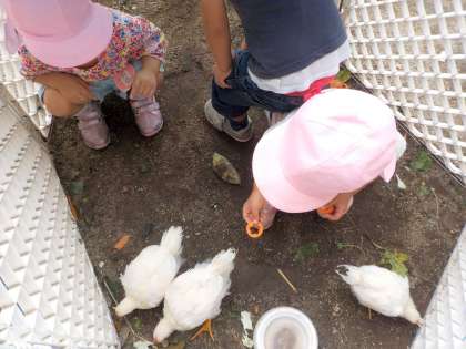 ヒヨコやウサギ,クラスで飼育している生き物などに,ご飯をあげることを楽しんでいる3歳児。今日もニンジン,キャベツ,リンゴを持ってきて,さっそくヒヨコにあげてみます。「僕が(わたしが)あげたニンジン食べた」「キャベツの方がよく食べる!」と嬉しそうにしています。