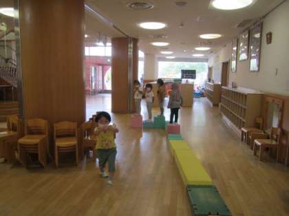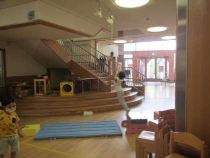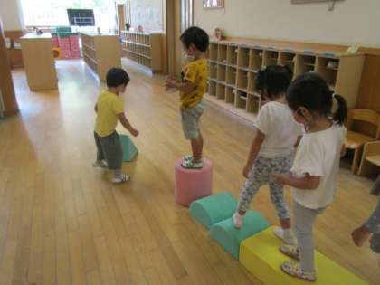 今日は竹間公園に行きました。そこで,年長児の様々なコースの竹馬をする姿をじっくり見ていましたよ。その姿を見たことで,保育室に戻ってからは「これ(平均台)出して!迷路作りたい!」と意気込む姿が見られました。ホールに平均台や積み木を組み合わせ,さらに縄跳びや三角馬を足したりして,より大きな迷路となりました。また,少し高い所にある目印をタッチするにはどうしたらいいか考え,挑戦する姿が多く見られました。運動会を前に,身体を動かす楽しさを十分に感じている子どもたちです。