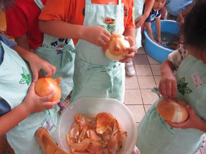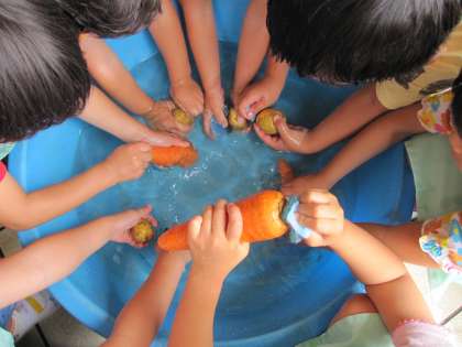 幼稚園やほしファームでできたジャガイモ20kg、たまねぎ10kg、人参22本、合い挽きミンチ肉7kg、カレールー19箱、これだけ使って、5つの大鍋でカレーをつくりました。年中児と年長児が洗ったり、皮を剥いたり、包丁で切ったりして、みんなの分をつくりました。おいしい匂いが幼稚園中に満ちていきます。「まだか?」と年少児も二階のキッチンにやって来ます。教職員も総出です。ぐつぐつ煮えてくると「ルー入れんとあかんで」と催促に来る子どももいたりします。