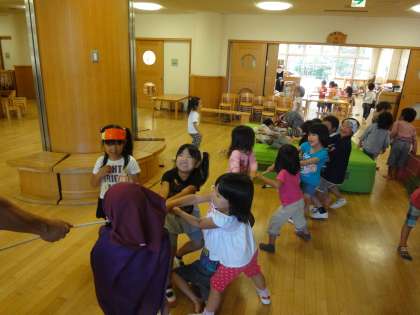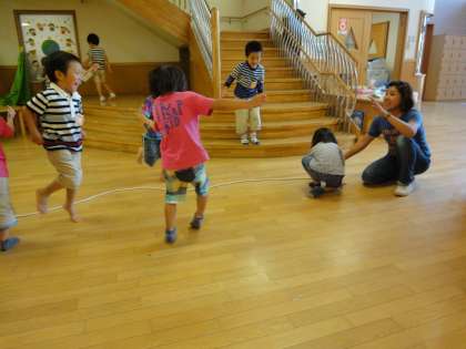 4歳児の子どもたちは今,長い縄で遊んでいます。
