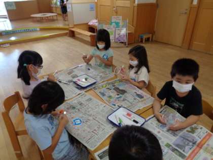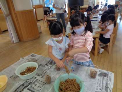 友達が植え始めている様子を見て,自然と子どもたちが集まり,順番に植えていきます。友達がやっているから,自分もやってみようと友達から刺激を受けている姿に,友達の存在がどんどん大きなものになっていることを感じました。できたカップをテラスの机に並べていたのですが,子どもたちで「こっちに置くんだよ」と伝える姿がありました。伝えてあげたいと思える気持ち,素敵ですね。