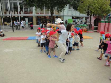 3歳児の子どもたちが広い公園に出て、電車になってお出かけして遊びました。