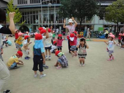 くまさんもやってきて、みんなで追いかけ遊びをしました。追いかけられたり追いかけたりすることを楽しんでいる子どもたちです。広い公園なので、思いっきり走って遊びました。みんなで遊ぶと楽しいね。