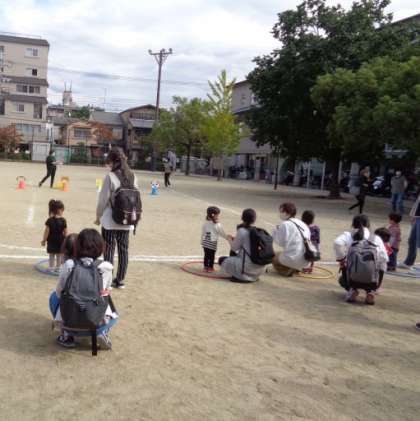 遊戯室や園庭で三輪車などの乗り物に乗ったり,ジャンプ遊びをしたりして遊びました。そして,広い公園にでて,お家の人と一緒に体操やかけっこをしました。楽しかったね。