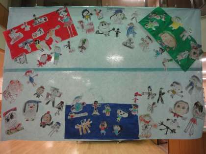 みんなが描いた絵を貼り合わせて,楽しい帽子取りをしている旗ができました!