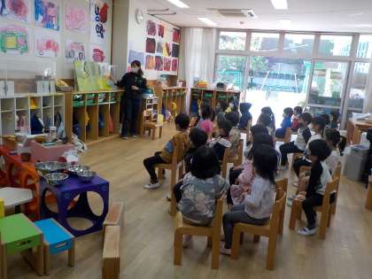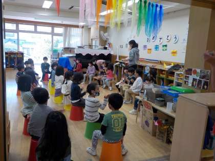 先生からの“お楽しみ”では,新聞紙マジックや大型絵本,紙芝居を見て楽しみました。