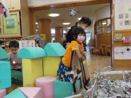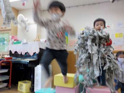 先週から楽しんでいる新聞の遊びを今日も楽しみました。段ボールの囲いに細かくさいた新聞を入れると,プールやお風呂のイメージで泳ぐことを楽しんでいました。積み木でつくった家をつなげ,「ここは髪を乾かすんだよ」とイメージを伝えたり,ジャンプ台をつくってそこから新聞プールにジャンプをしたりと,新しい楽しみ方をしている子どもたちもいました。片付けも「おばけちゃんにご飯あげるんだ」とカラーポリ袋に最後まで入れる姿がありました。開放的に遊べる新聞遊び,今後も楽しんでいきたいと思います。