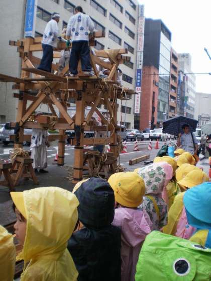 小雨振る中,年長児が鉾が建つ様子を見に行きました。