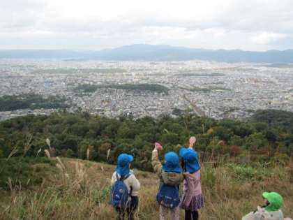 昨日,4・5歳児で大文字山へ園外保育に出かけました。朝からワクワクしていた子どもたち。急な山道や階段がありましたが,足に力を込めて一歩一歩進みました。友達や先生,パパママティーチャーの方と励まし合いながら山頂まで登ることができました。山頂からの景色をじっくり見たりお家の方との『光の交信』を楽しんだりしました。