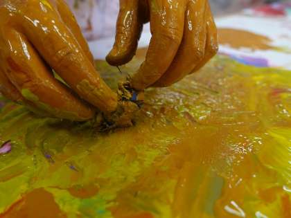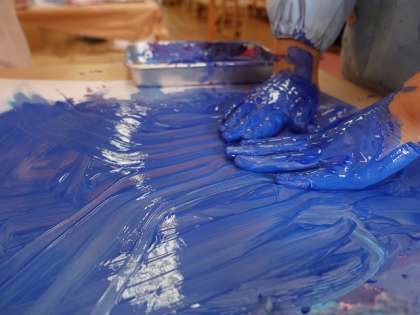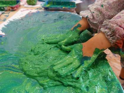 いろいろな色を混ぜたり,花紙を絵の具と混ぜたりこねたり。色の変化を感じたり,感触を楽しんだりして,「もっとやりたーい!」と,とても長い時間じっくりと楽しみました。