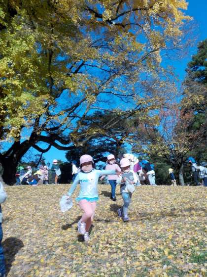 イチョウやモミジの葉がきれいに色づき,拾って花束をつくったり,集めて葉っぱのシャワーで遊んだりしていました。