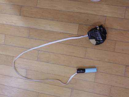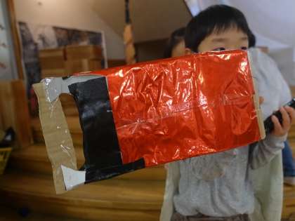 手裏剣を遠くまで投げたり,キラキラ光らせてまぶしくして逃げる道具をつくったり,ぐるぐる回して敵をやっつける道具をつくったり。忍者のイメージを膨らませて,どんどん道具や修行を考えて遊んでいます。