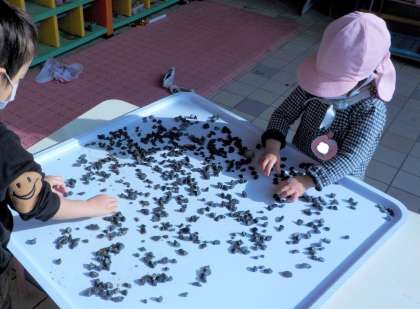 集めた化石を大きな白い器に出すと,「これ顔,足,歯・・・」と並べてみたり,「もしかしたらこれティラノサウルスじゃなくて,サメかもしれん」といろいろな想像をしたりして楽しむ姿があります。