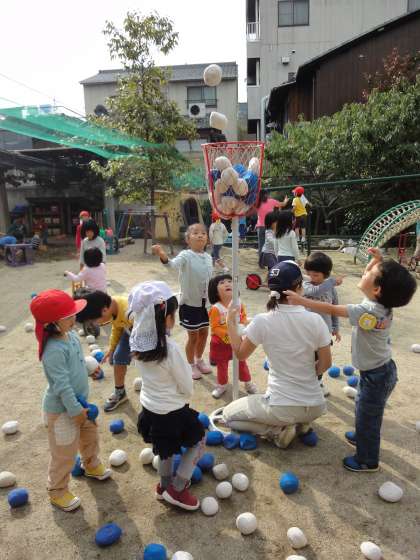 運動会で,保護者の方が玉入れをされていたのを「がんばれー!」と応援しながら見ていた子どもたち。やってみたいなぁという思いを持っていたと思います。今日は,園庭に玉入れのゴール杯を出すと,年長児も年中児も年少児もやりたいと集まってきました。玉を手に取ると勢いよくゴール杯に向かって玉を入れ楽しんでいました。