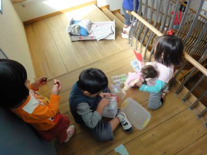 「これを持って,ピクニック行こう!」と言う子どもの提案で,3階のプールが見える踊り場までお出かけしました。窓からプールサイドに書かれた恐竜の絵を見て「恐竜がいるわ,眠っているからね,しっ〜!」と一人の子どもが言いました。するとその場にいた子どもたちが,自然とひそひそ声で話したり,ドアの隙間から様子をのぞいたり,自分たちも恐竜になったりとその場の雰囲気を感じ,イメージ豊かに遊んでいました。