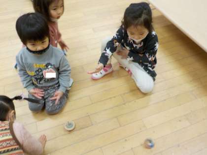 「先生,見て!」とこまを回して見せてくれたりして遊ぶことを楽しんでいました。