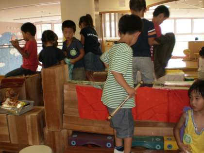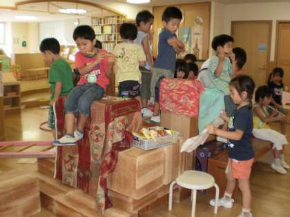 積み木を運び込んでみんなが乗れる鉾ができてきました。鉾の上でお囃子もしています。共通のイメージがあって遊びが構成されていくのですね。きれいな懸想品にと、次々に布が動員されていきます。お姫様の衣装の布も借り出されているようです。見立てて遊ぶ中でイメージがさらに広がります。本物に触れる体験が生きていることを感じます。年中年少の子どもたちが「さすが」「来年は自分達も」と羨望のまなざしで見ています。伝統の遊びが繋がっていくことは嬉しいことですね。
