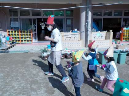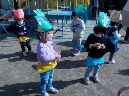 今日は節分の日だったので,各クラス園庭で「おにはそと!ふくはうち!」と豆まきを楽しみました。