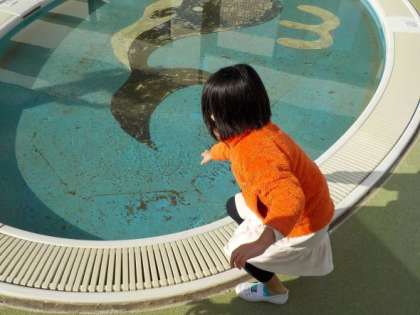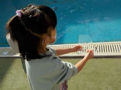 土日の寒さでプールの水が氷になっていました。3歳児の子どもたちと3階まで探検に出かけていると,4歳児の子どもたちがプールで氷を集めていました。3歳児の子どもたちも氷に触ってみて「冷たい!」「こんなに大きいよ」と感じたことを伝える姿がありました。保育室まで持って降りてクラスの友達に知らせたり,色水と混ぜて遊んだりして楽しみました。