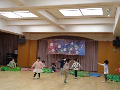 今日はちゅうりっぷ組の生活発表会でした。お家の人に見てもらうことを楽しみにしながら,車とヘリコプターに乗って探検に出かけ,おばけちゃんを探したり,踊ったりして