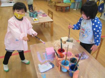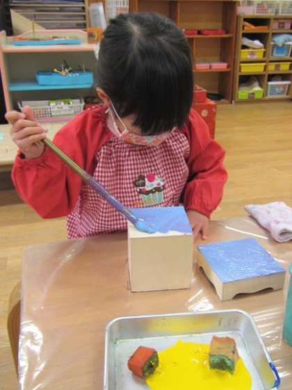 進級記念品の木箱に,色を塗りました。赤・ピンク・オレンジ・青・水色・緑の絵の具を用意しました。子ども達は好きな色の筆をとって入れ物の外も中も色とりどりに塗り始めました。更に,黄緑・黄色・白などの絵の具で指やスポンジでスタンプをして色んな模様や色の交じりが見られました。色を塗っているときに「いつ持って帰れる?」「こんな色になったよ!」と,持って帰れる嬉しさや色の変化が楽しかった子どもたちでした。