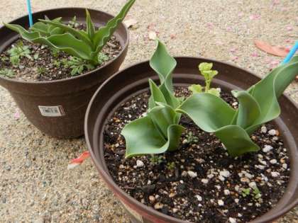 3歳児が植えたちゅうりっぷの球根がどんどん伸び,小さなつぼみも見え始めました。進級するときには咲いていると嬉しいですね。また,桃の花は若葉も多くつき始めました。そんな春を感じながら,園庭には,元気に過ごすハットリくんたちです。