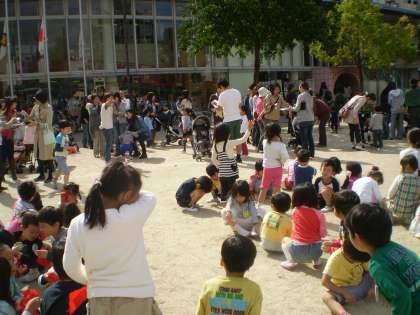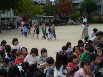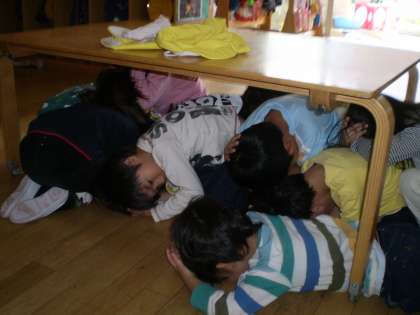 「訓練,訓練,今ガタガタと地震がおきてます。」と園内放送があり,子ども達は後頭部を押さえて近くにある机の下に避難し,そして地震が治まったことを聞いて園庭に出ました。また,第三次避難として竹間公園に移動しそこでお家の人が来られるのを待ちました。今回は11時10分に大地震が発生し、道路が遮断され自転車や自動車が使えない事を想定し,お家の人には徒歩でお迎えをお願いしていました。中には最長で43分ほどかかり「フーウ フーウ」と汗をかきながら走って来られたお母さんもおられました。子ども達はお家の方の顔を見てほっとしたのか,手をギューとつないで帰って行きました。緊急時親子で一緒に避難する経験を今後の安全対策に生かしたいと思います。