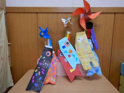 もうすぐ5月5日,こどもの日。今日は各クラスで,こどもの日に関する絵本や紙芝居を見たり,歌をうたったりして過ごしました。心地よい風が吹く一日で,園庭のこいのぼりも大きく泳いでおり,「すごい」「いっぱい泳いでる」と嬉しそうに眺めていました。