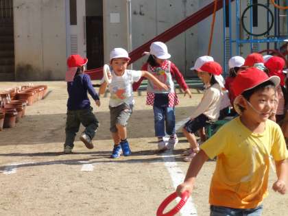 よく晴れた空の下、幼稚園の園庭で年中児がリレーをして遊びました。