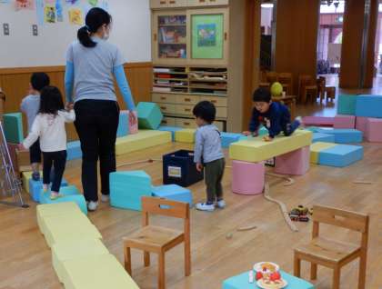 今日は朝から雨がポツポツと降っていたので,保育室のウレタン積み木で遊ぶことを楽しんでいました。坂道や,階段,ちょっとジャンプしないと渡ることができない道,滑り台,長い一本道など,様々なコースを作って,体を動かして遊んでいた子どもたちです。