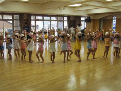 創立10周年を記念してみんなで踊れる盆踊りができました。作詞作曲は学校運営協議会もえぎテインクルです。みんなの思いを一つにして出来上がりました。子どもたちはプールの前にひと踊り、合いの手や掛け声もあって音頭の雰囲気を楽しんでいます。親しみやすい曲想です。これからきっと大勢のみなさんに愛されていくことでしょう。