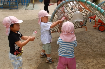 3歳児は,透明容器に水を入れると地面に水で絵を描いてみたり,先生や友達と水の掛け合いっこを楽しんだりしていました。