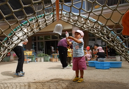 最後には,ぺちゃんこになった袋を見て満足そうに「火が消えたね」と先生に伝える姿もあり,水遊びの中でもイメージをもって遊ぶことを楽しんでいます。