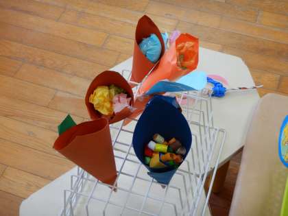 コーンのような形の画用紙に,きらきらのシールを丸めたものをたくさん詰めたり,くしゃくしゃにした画用紙を詰めたりして,おいしそうなアイスをつくっていました。明日もいろいろなものをつくって遊ぼうね!