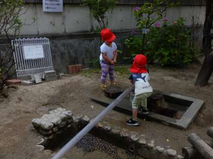 お弁当を食べた後は気温も高くなっているためか,午前中は保育室の中で遊んでいた子どもたちも,園庭にで遊ぶ姿がありました。水遊びの場で,何度も水を容器に入れ替えながら遊んだり,ポンプからトイをつなげて水を流しながら遊んだり,水の冷たさや心地よさを感じているようでした。