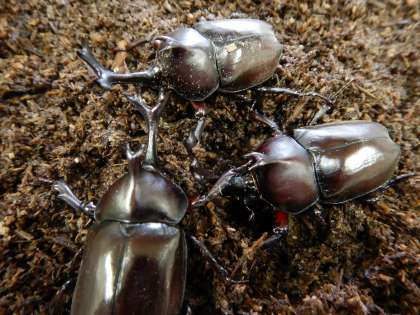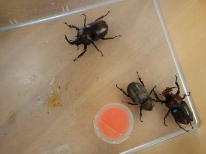 すると,今朝,保育室の床に転がるカブトムシを発見しました!ついに,出てきたのです!恐る恐る少しだけ土を掘ってみると,3匹も出てきました。その後も続々と出てきて,たくさんのカブトムシが出てきました。