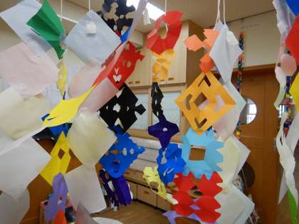 「もっとつくろう!」といくつもつなげたり,色々な折り方や切り方を試すことを楽しんだりしていました。