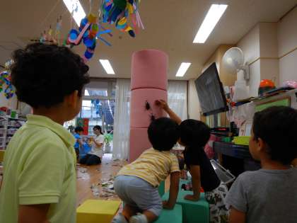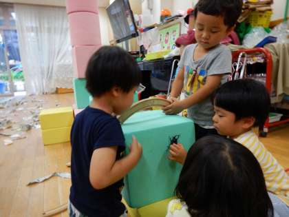 子どもたちはカブトムシのお家をつくって遊んでいます。積み木を長くつなげたり,高く積み上げたりして,カブトムシの様子をじっくりと眺めています。カブトムシが家から出てきていきそうになると,虫が大好きな友達を呼び,助けを求め,かかわり合う姿もありました。