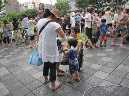 今日は臨時休園でした。先生達は祭りのパトロールに出かけます。そろいの黄色のポロシャツに腕章をつけて、今年は主に御池通で子どもたちに声かけをしました。家の人と一緒で嬉しそうな、意外な所で出会って恥ずかしそうな子どもたちにたくさん出会いました。また山鉾に乗っていたり、前後で行列に参加したりしている卒園生にも出会いました。元保護者の懐かしい方々にもお目にかかりました。町に出ることで先生達もたくさんの出会いを経験し学ぶところがありました。当園ならではの祇園祭の日だなと改めて思いました。ありがとうございました。