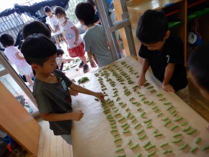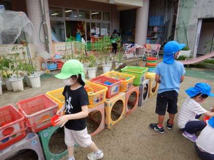 毎日水やりをしながら育てていたバジルやシソ,枝豆も自分たちで収穫しました。枝豆はゆり組,すみれ組それぞれ300個以上も採れて,子どもたちも大喜びでした!