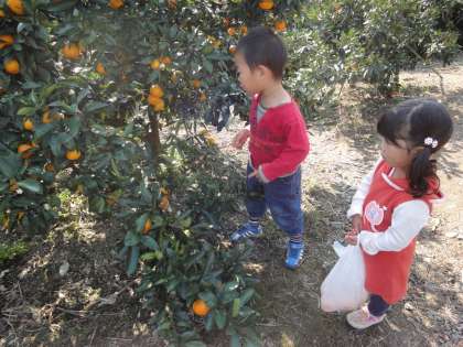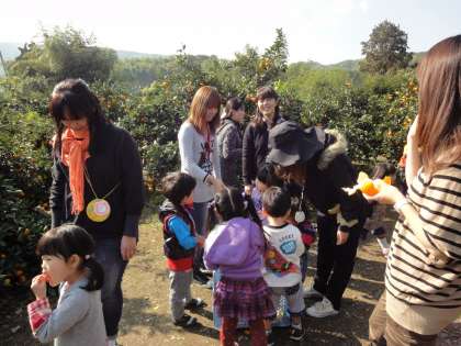 たくさんのみかんの木を見て,大喜びの子どもたち!