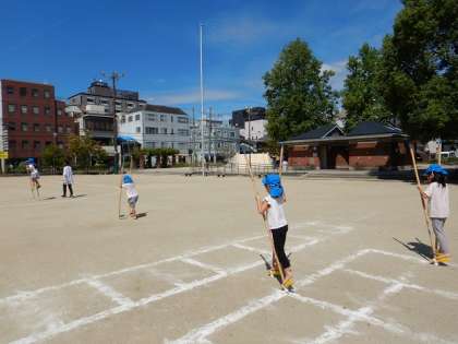 竹馬にも挑戦しています。室内で乗るときとは違い,公園では地面に凹凸があったり,乗るときに体を支える壁が少なかったりします。落ちそうになってもバランスをとって持ち直したり,壁の支えなしで乗る空中乗りに挑戦したりするようになっています。